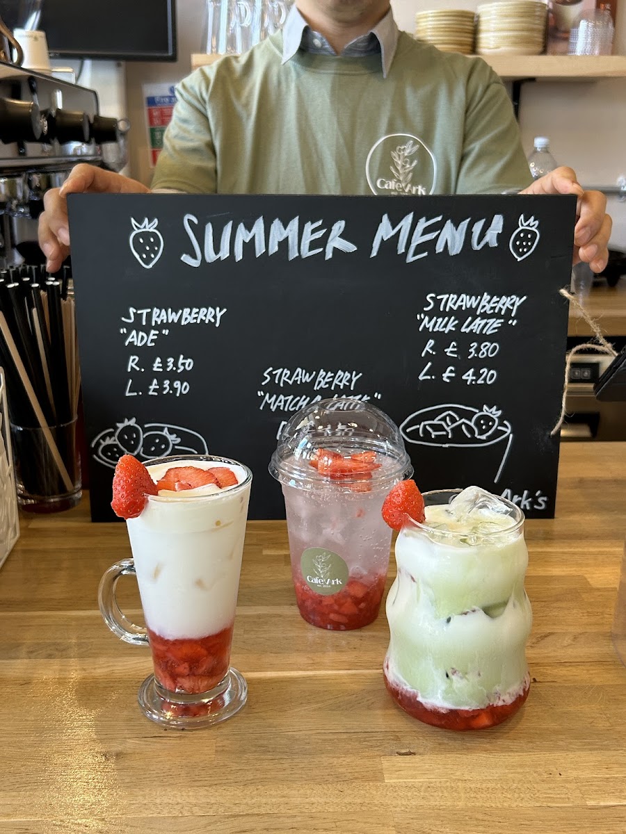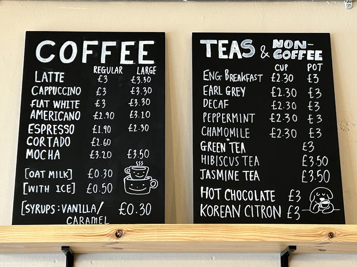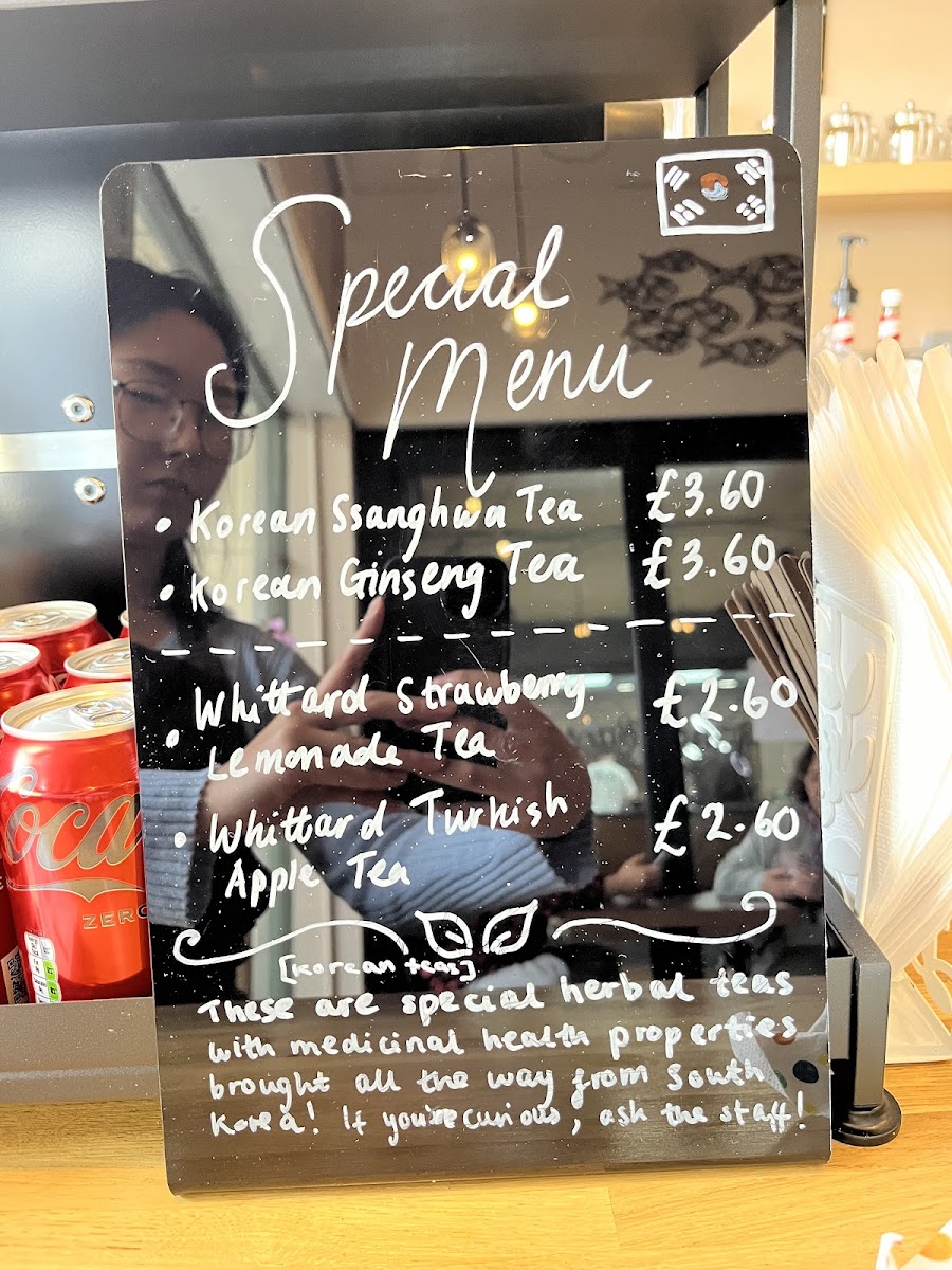 The menu features a variety of coffee beverages, including classics such as latte, cappuccino, flat white, americano, espresso, cortado, and mocha, with prices ranging from £1.90 to £3.30. Additionally, there is a selection of teas including English Breakfast, Earl Grey, Decaf, Peppermint, Chamomile, Green Tea, Hibiscus Tea, Jasmine Tea, and several Korean teas such as Korean Citron, Ssangha, and Ginseng teas. Hot chocolate is also available.